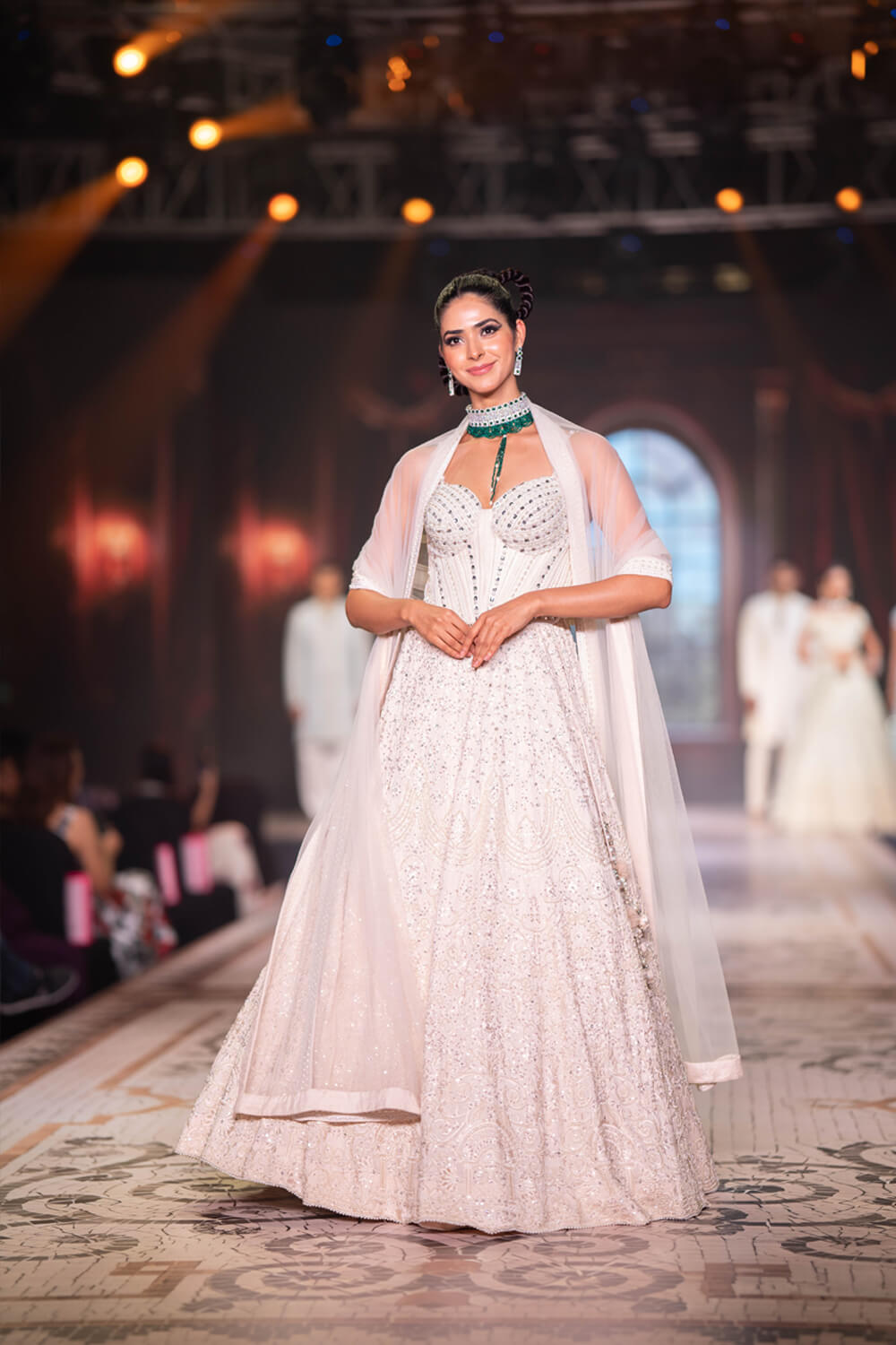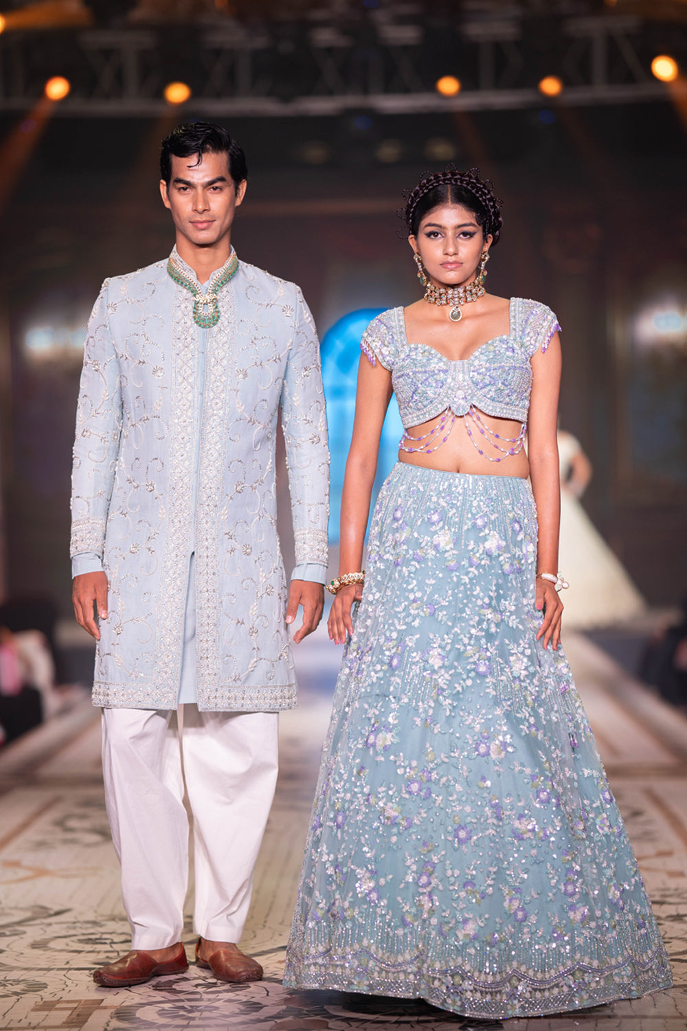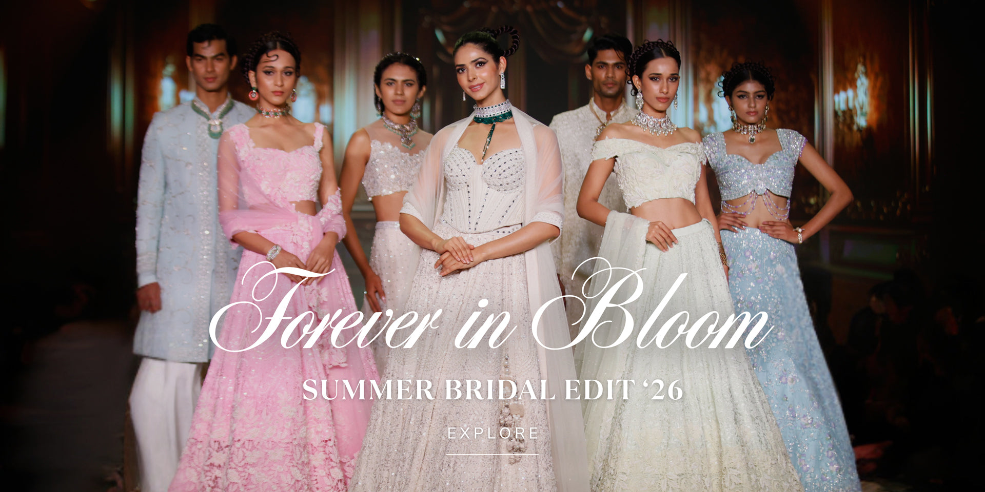 With a fusion of contemporary and heritage elements, these bespoke designs blend elegant silhouettes with vibrant Indian craftsmanship, perfect for those seeking exclusivity and timeless style for their special day.