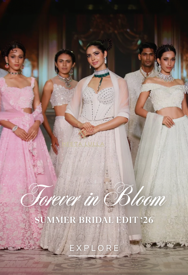 Neeta Lulla's Bespoke Services offer brides and grooms the chance to experience custom couture, designed through one-on-one appointments with the designer herself. Each piece is meticulously crafted using traditional embroidery and luxurious fabrics, tailored to individual preferences for weddings, receptions, and more.