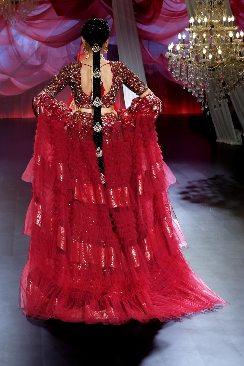 Drenched in crimson dreams — a bridal lehenga handcrafted in raw silk, with a embellished blouse and lehenga adorned with glistening sequins, intricate cutdana, delicate pearls, and timeless zari paired with a tulle dupatta with embellished border.