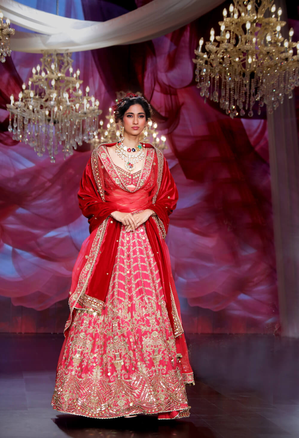 Almonzo, an heirloom ensemble, captures Mughal grandeur with ivory and vintage gold motifs on wine, accented by gold Katdana, sequins, and stones.