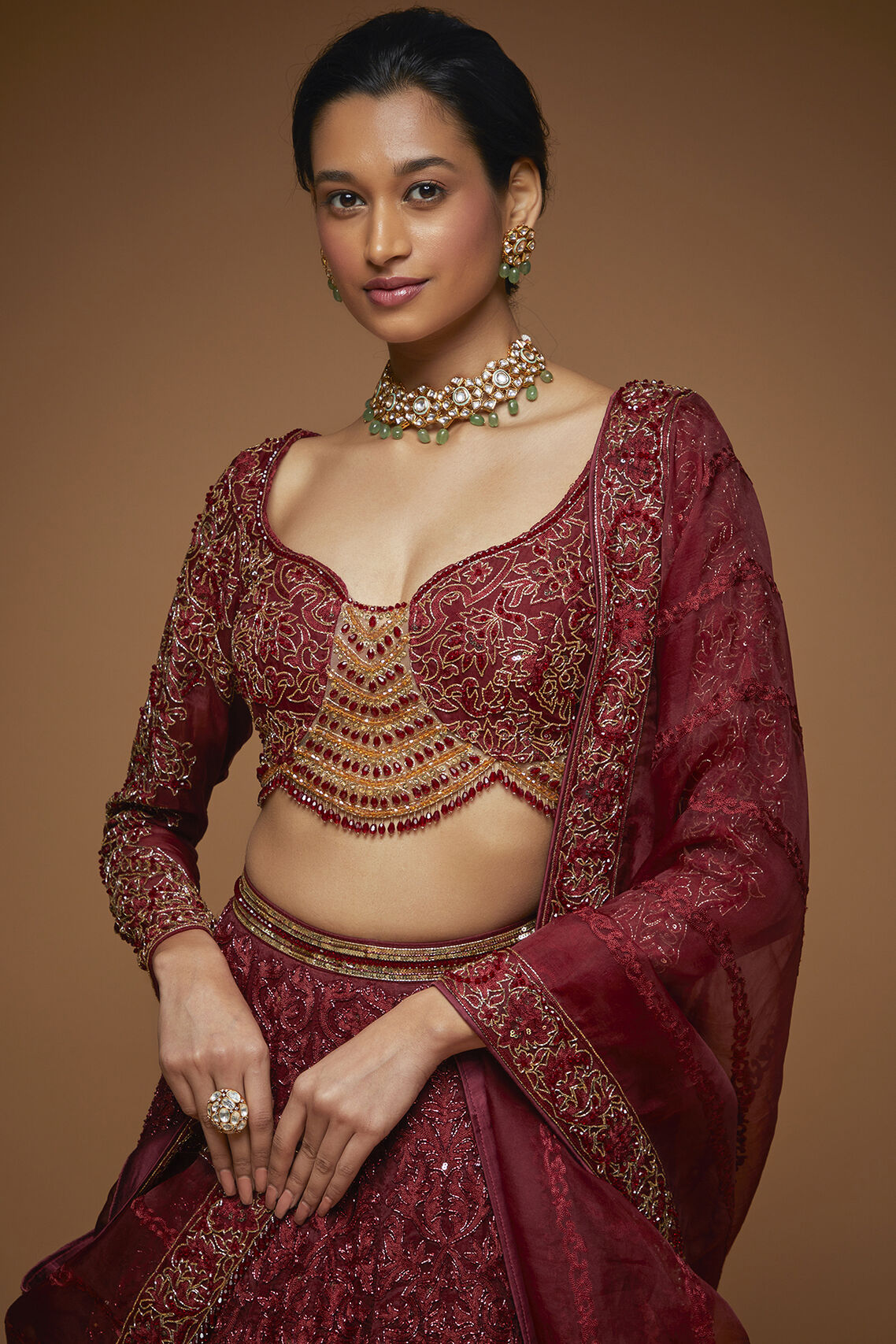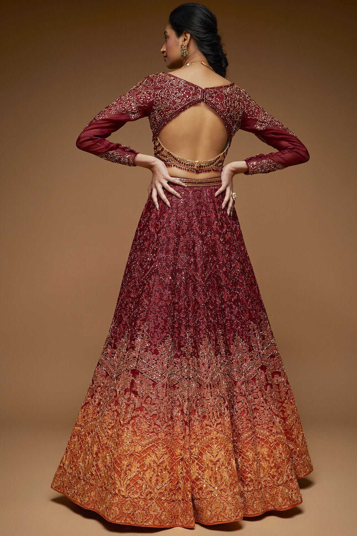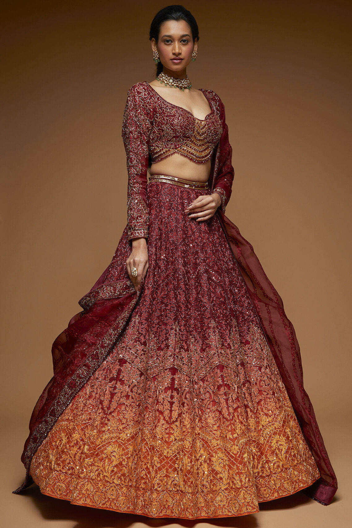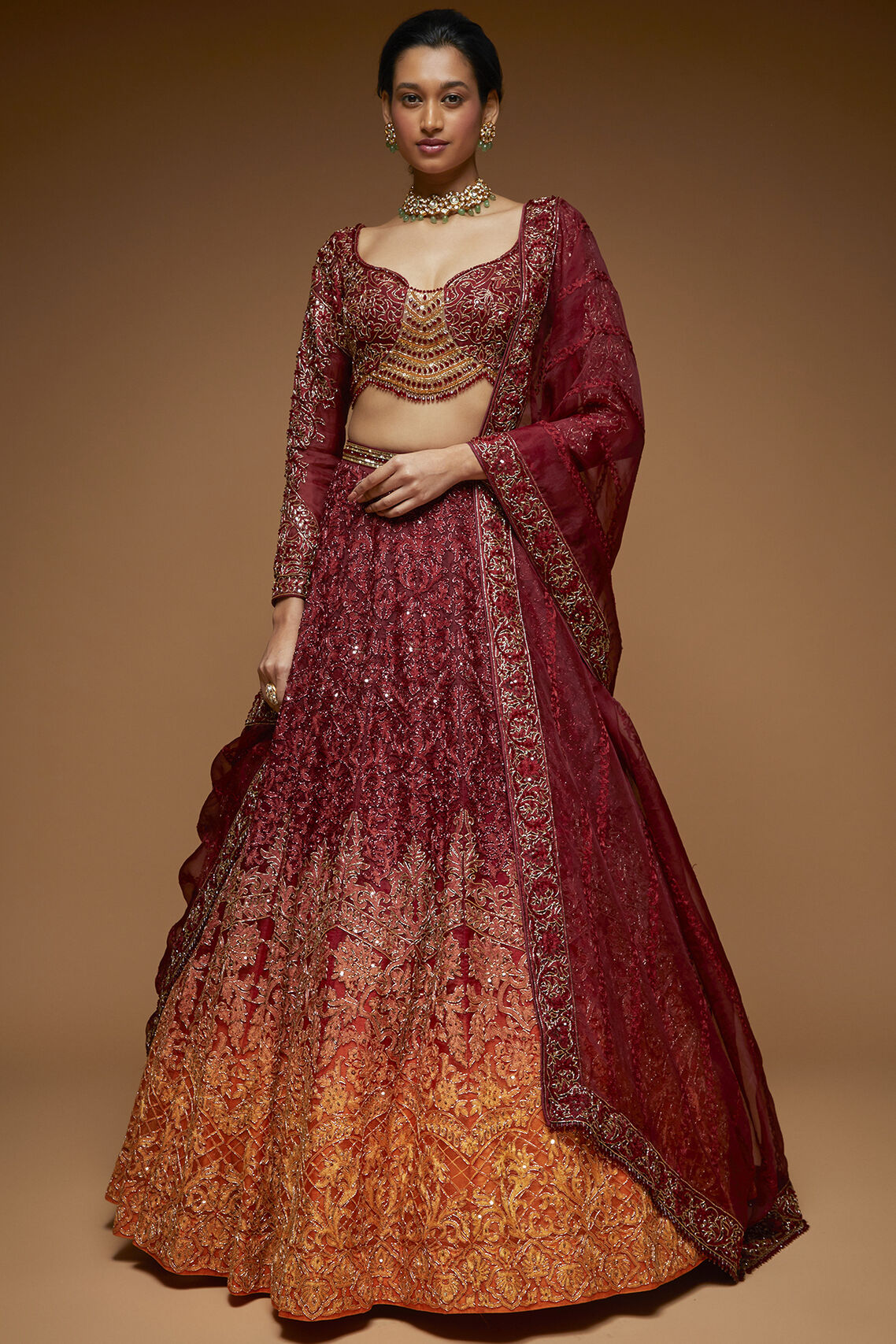 Darsya ombre lehenga in Garnet & Mandarine color embellished in overall resham work highlighted with self Katdana beads paired with full sleeves resham work blouse highlited in gold Katdana and Ruby color stones, along with tulle dupatta with 2'' border work.