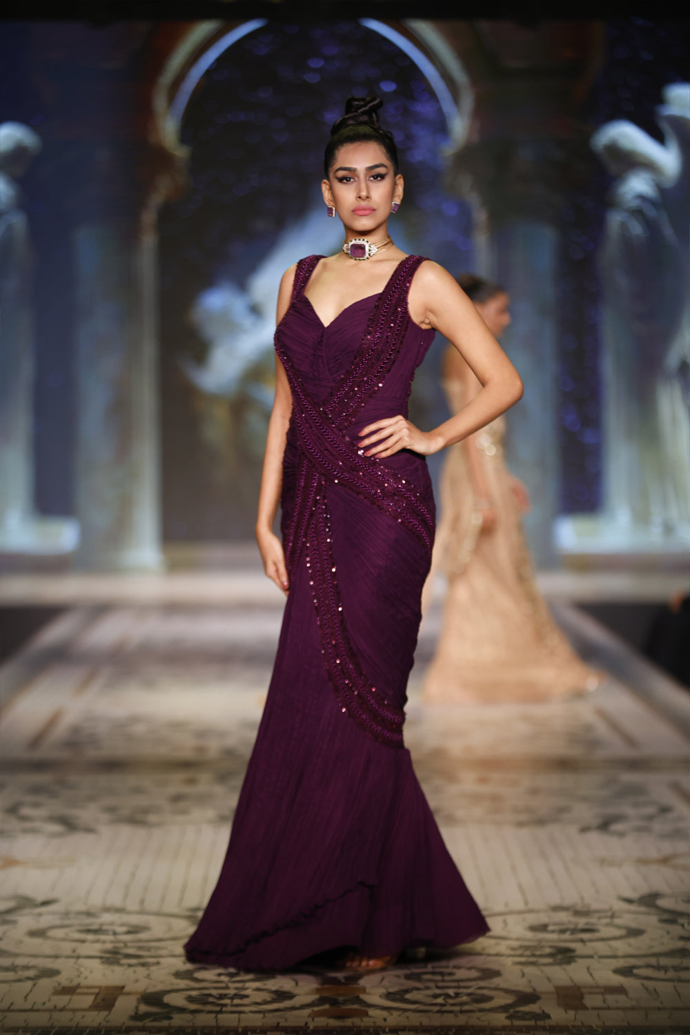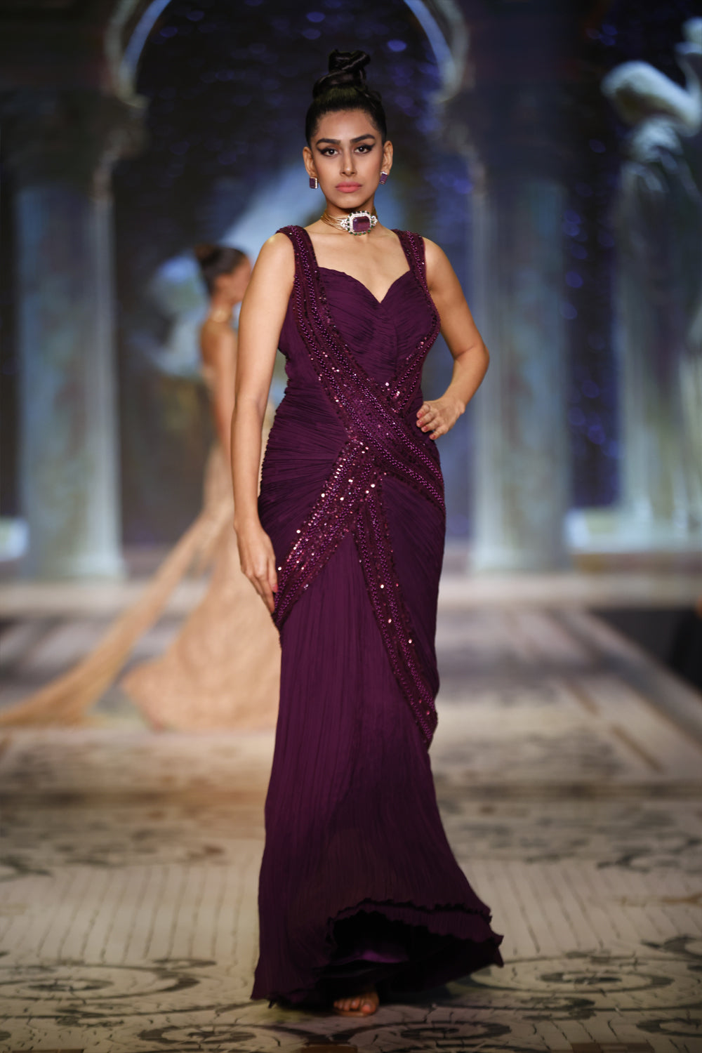 Plum-wine sleeveless gown with a sculpted sweetheart neckline, featuring delicate ruching and tonal sequin detailing that contours the silhouette.