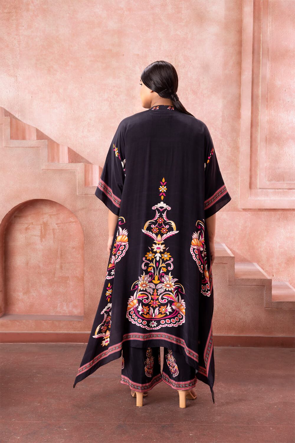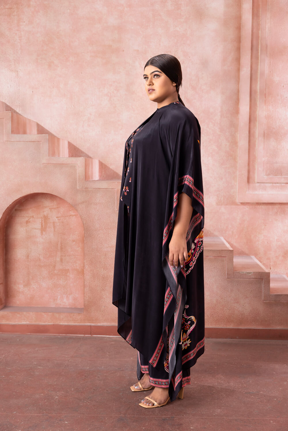 An elegant satin co-ord set with keyhole neckline,flowing overlay cape and intricate border prints.