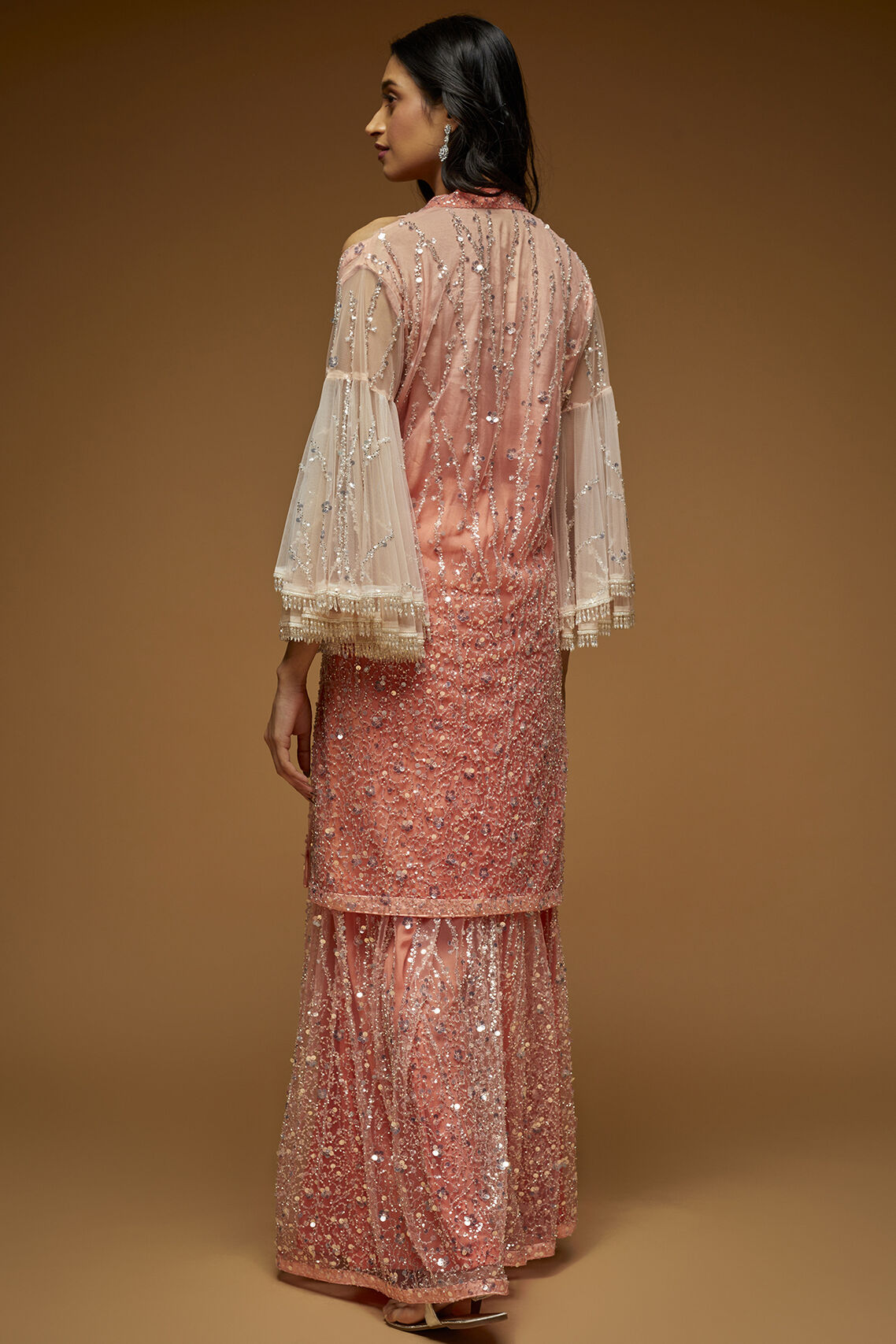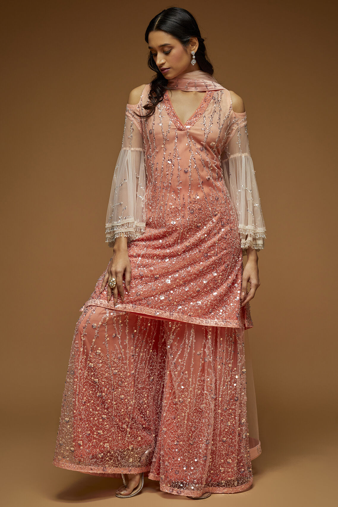 Kirsi overall embroidered shaded kurta with flared sleeve style along with sharara style bottom paired with tulle dupatta.