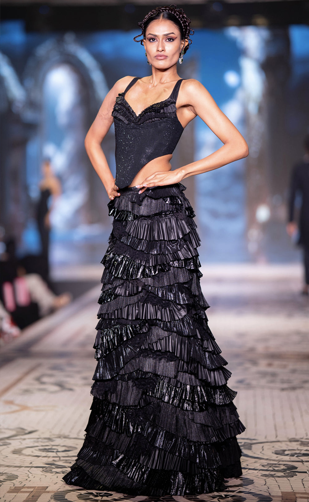 Black Corset Skirt Set features a sleek, shimmering v-neck corset blouse with a dramatic multi-tiered ruffled and ruched textured skirt. The structured bodice features a contemporary high-cut hem that transitions into the textured, voluminous layers of the skirt.