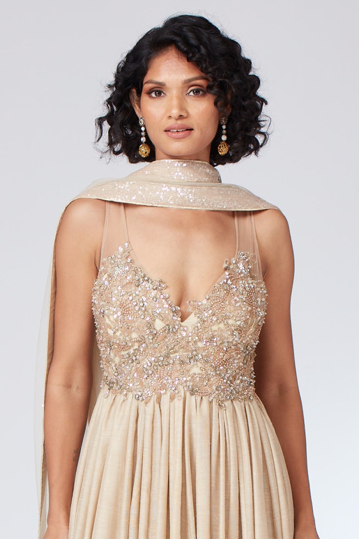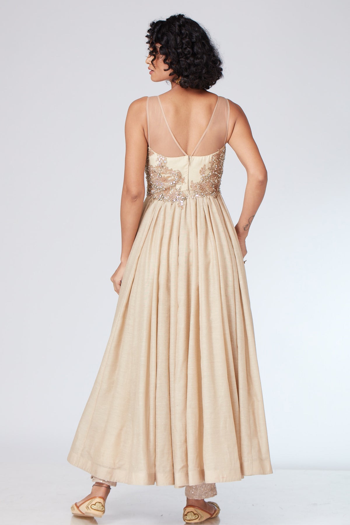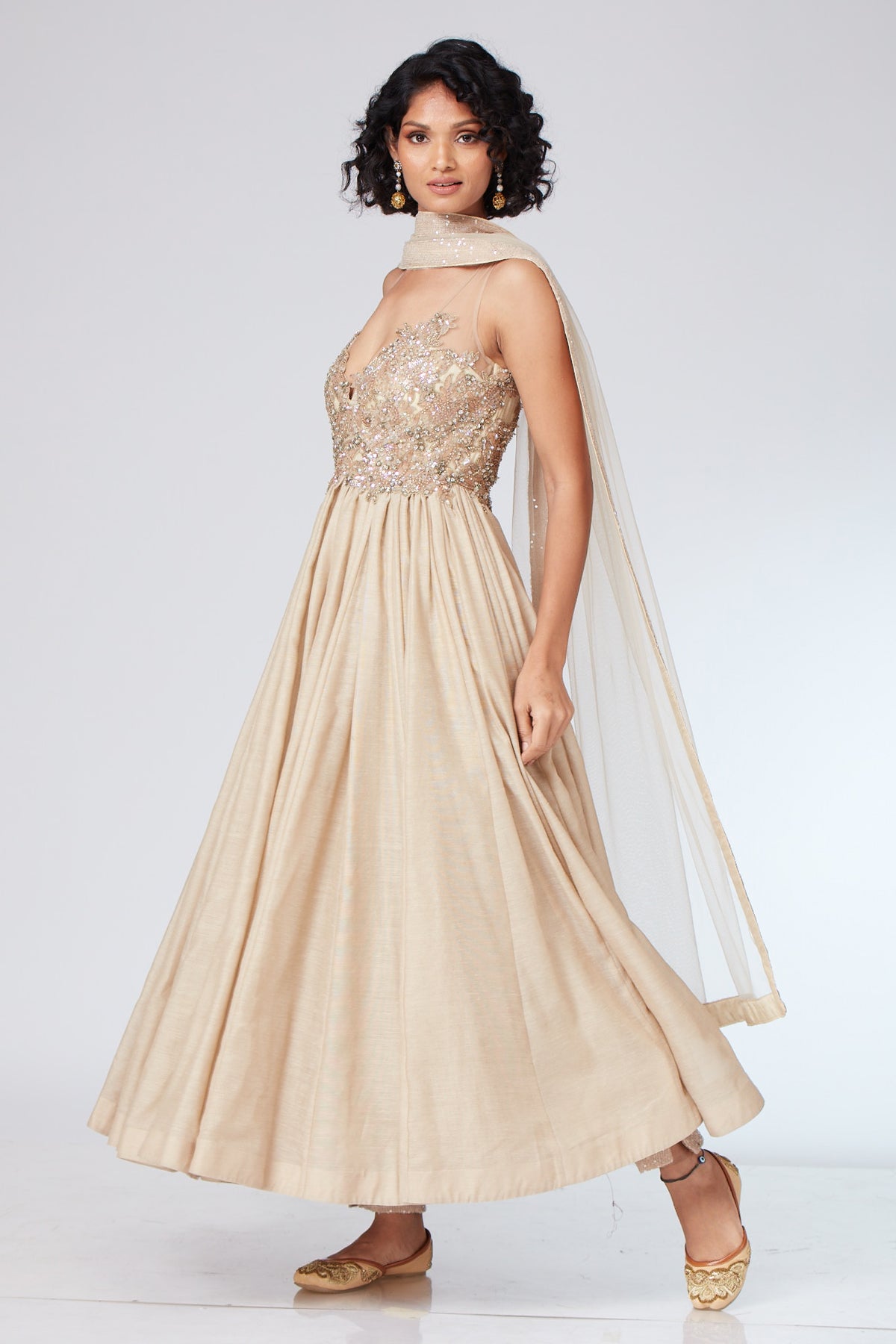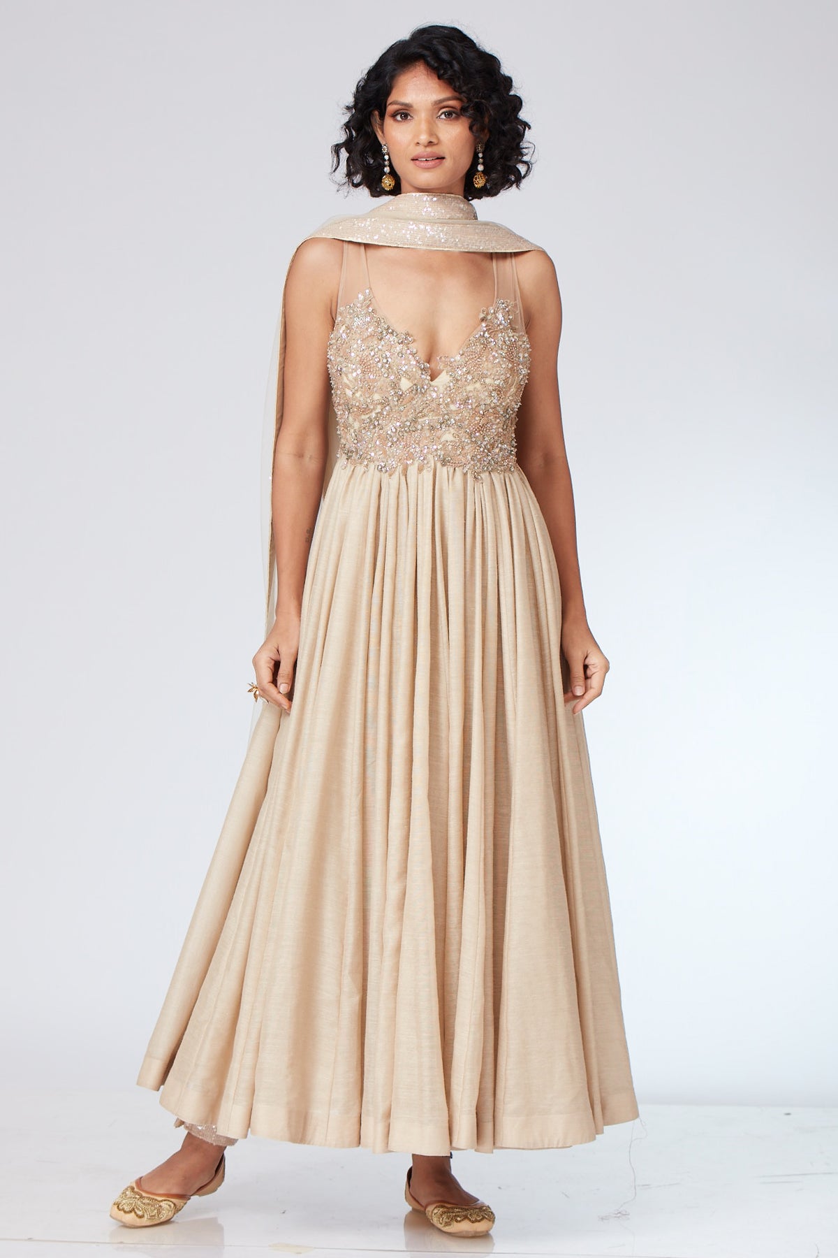 Navyali beige anarkali in crepe embellished with zari work in self silver and light gold on bustier teamed ankle length pants in crepe with tulle dupatta edged with 1” border.
