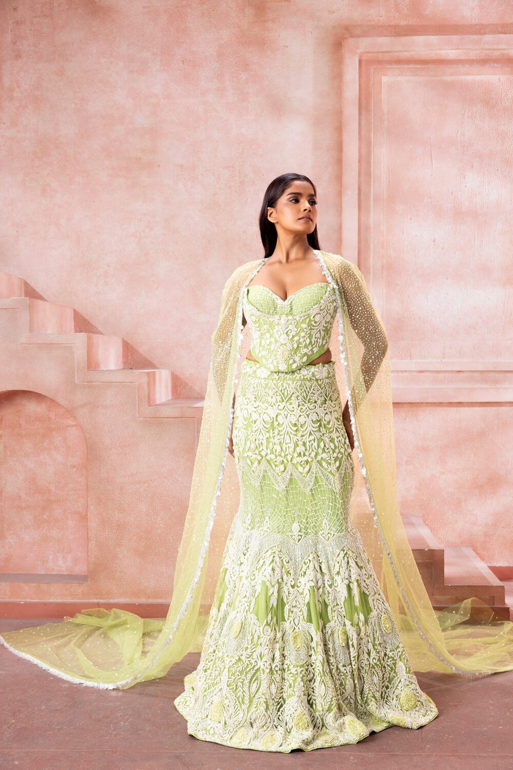 A pastel mint green skirt set richly adorned with resham embroidery,accented by delicate sequins,pearls and beadwork. The structured corset with with a fluid mermaid silhouette and sheer embellished drape creates an etheral statement.